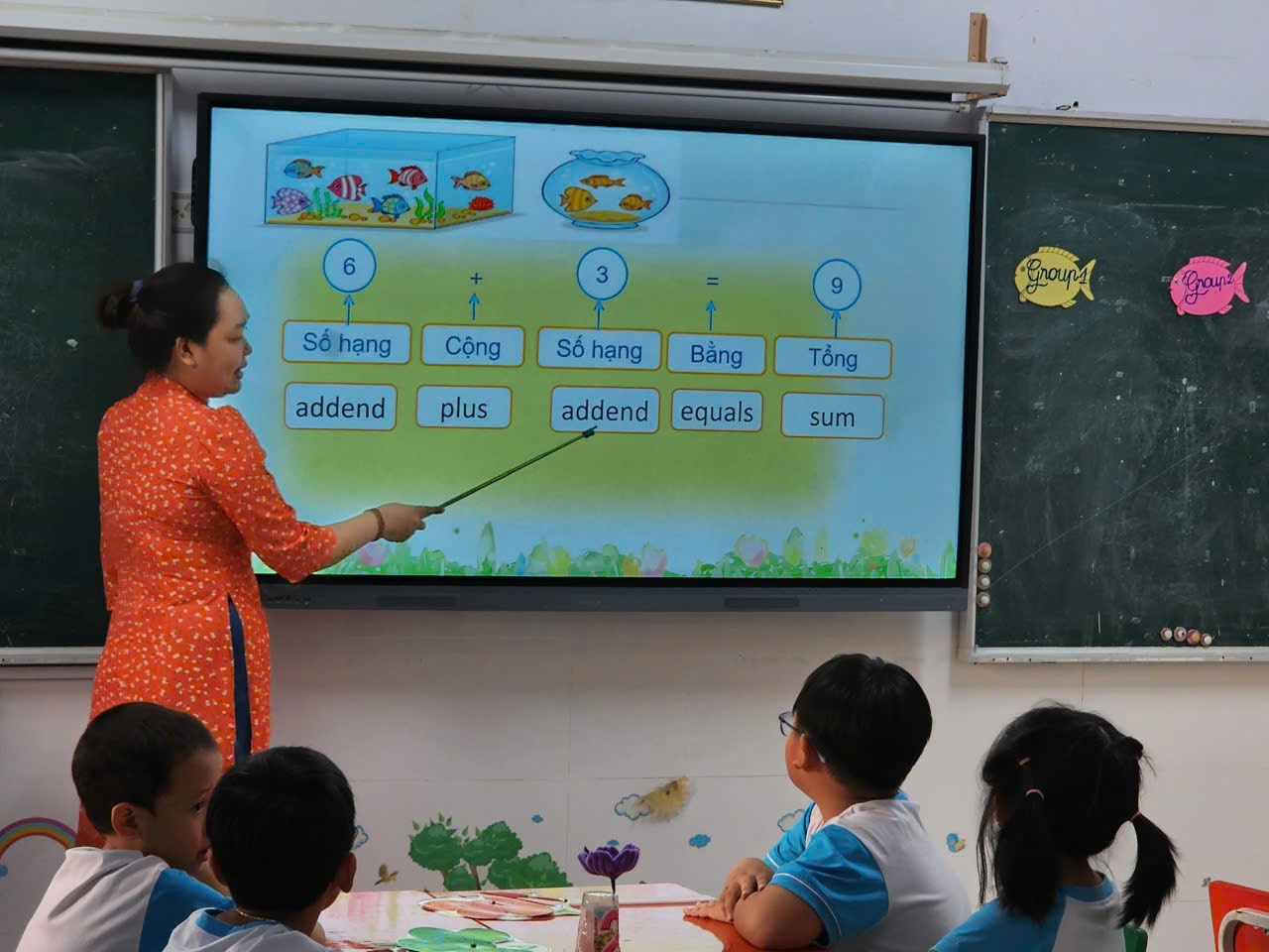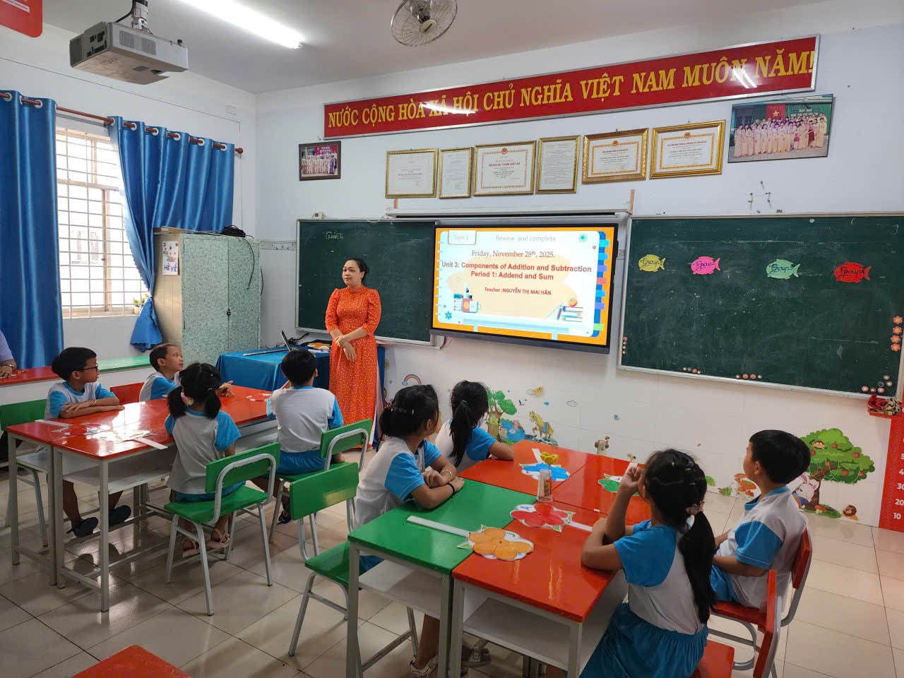 Tại buổi sinh hoạt, Thầy Vũ - Tổ trưởng tổ AV-TH đã trình bày mục tiêu, nội dung trọng tâm của mô hình dạy song ngữ, đồng thời minh hoạ qua một tiết dạy mẫu sinh động do cô Nguyễn Thị Mai Hân thực hiện. Các thành viên tham dự được quan sát cách giáo viên lồng ghép từ vựng, cấu trúc tiếng Anh đơn giản vào bài học Toán như: các thành phần trong phép cộng, tính tổng, đặt rồi tính và thực hiện giải một số bài tập,... Không khí buổi sinh hoạt diễn ra sôi nổi, nhiều ý kiến trao đổi thiết thực về cách lựa chọn thuật ngữ, cách hỗ trợ học sinh còn yếu tiếng Anh, cũng như phương pháp tổ chức trò chơi học tập để tăng hứng thú cho các em.