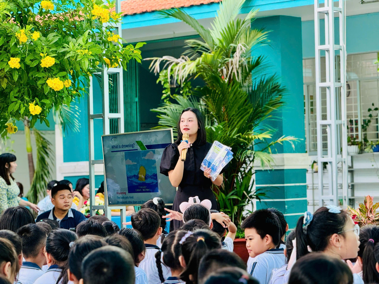 Điểm nổi bật của hoạt động là phần hướng dẫn kỹ năng thoát hiểm khi bị đuối nước và kỹ năng kêu cứu đúng cách. Các huấn luyện viên phổ biến cho học sinh những động tác cơ bản như nổi ngửa, thả lỏng cơ thể, giữ hơi thở và tự đưa người vào vùng an toàn. Ngoài ra, các em còn được học cách sử dụng những vật dụng quen thuộc như chai nhựa, phao tròn, áo phao để hỗ trợ cứu người mà vẫn đảm bảo an toàn cho bản thân.
