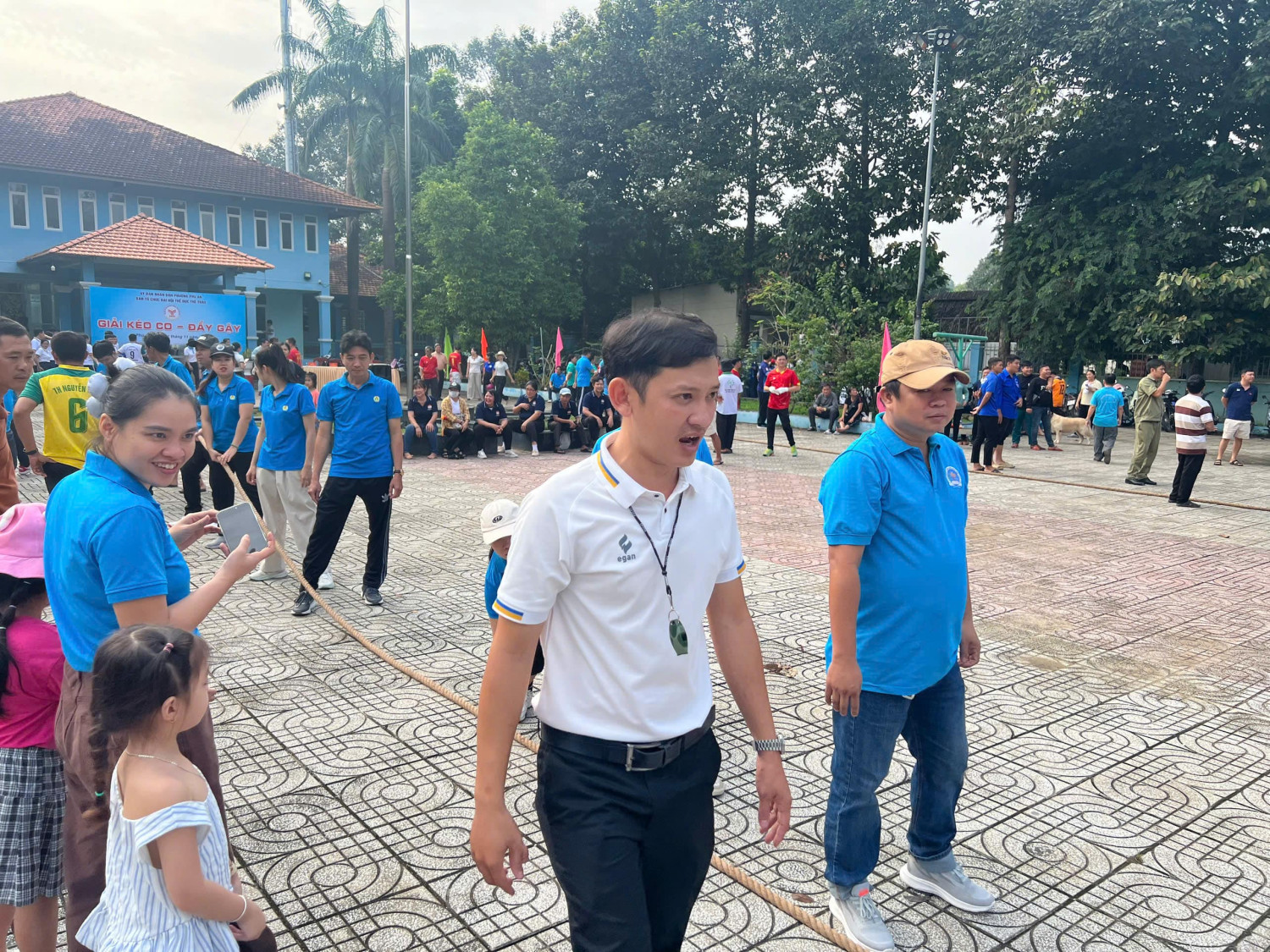 Đội thi kéo co của liên quân 3 trường: Mẫu giáo Tuổi Thơ - Tiểu học Tân An và Tiểu học Nguyễn Hiền tham gia với tinh thần quyết tâm cao, phối hợp nhịp nhàng và đầy năng lượng. Mỗi trận đấu kéo co hay đẩy gậy đều diễn ra gay cấn, thể hiện sự dẻo dai, khéo léo và tinh thần đồng đội của các thành viên. Khán giả liên tục hò reo, cổ vũ, tiếp thêm sức mạnh cho các vận động viên. Dù có những phút giây căng thẳng, nhưng tất cả đều hướng đến niềm vui và sự giao lưu thân thiện.