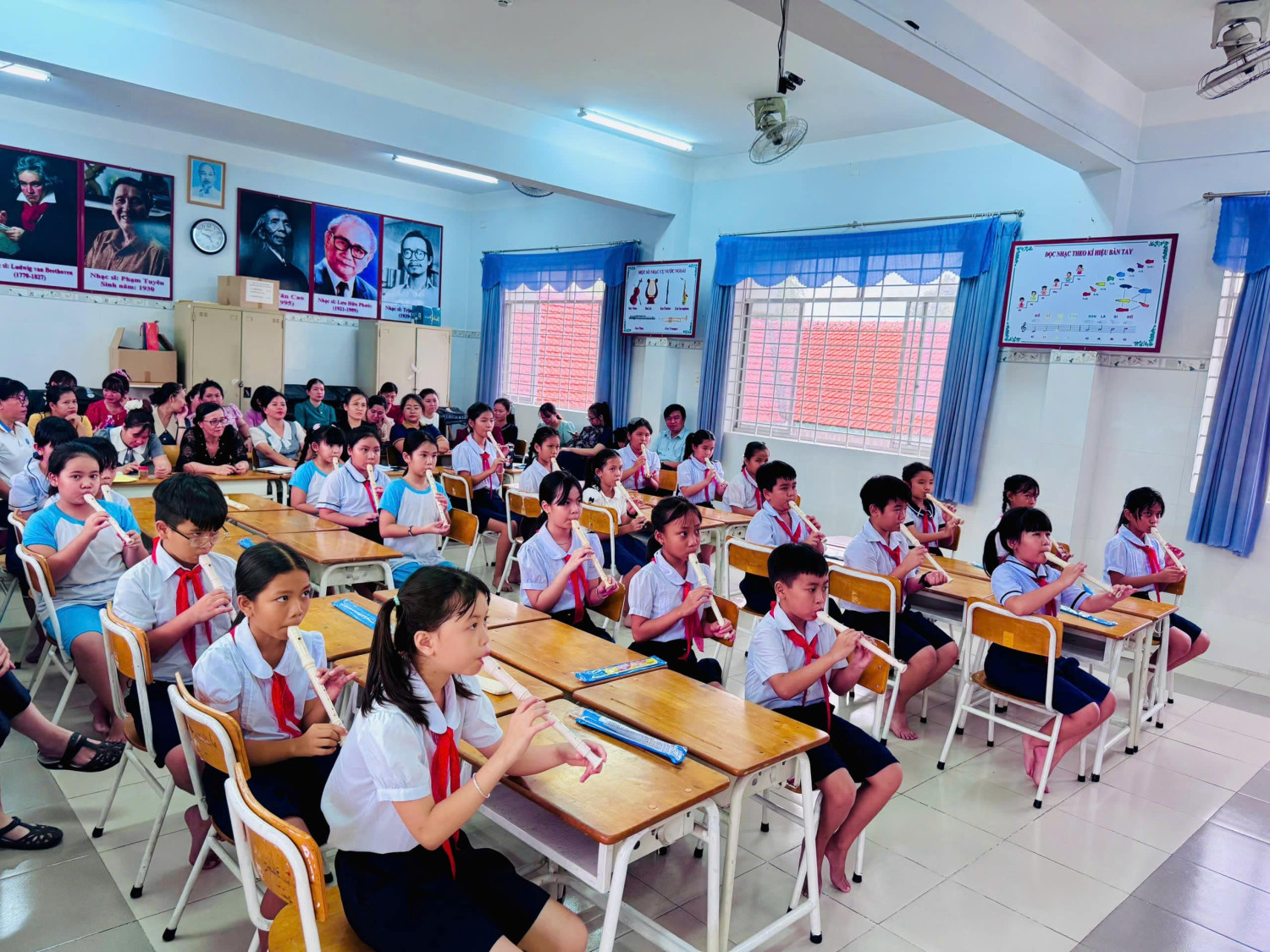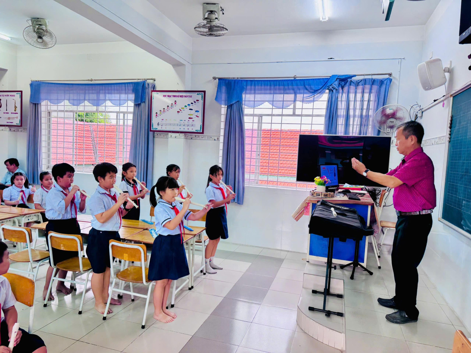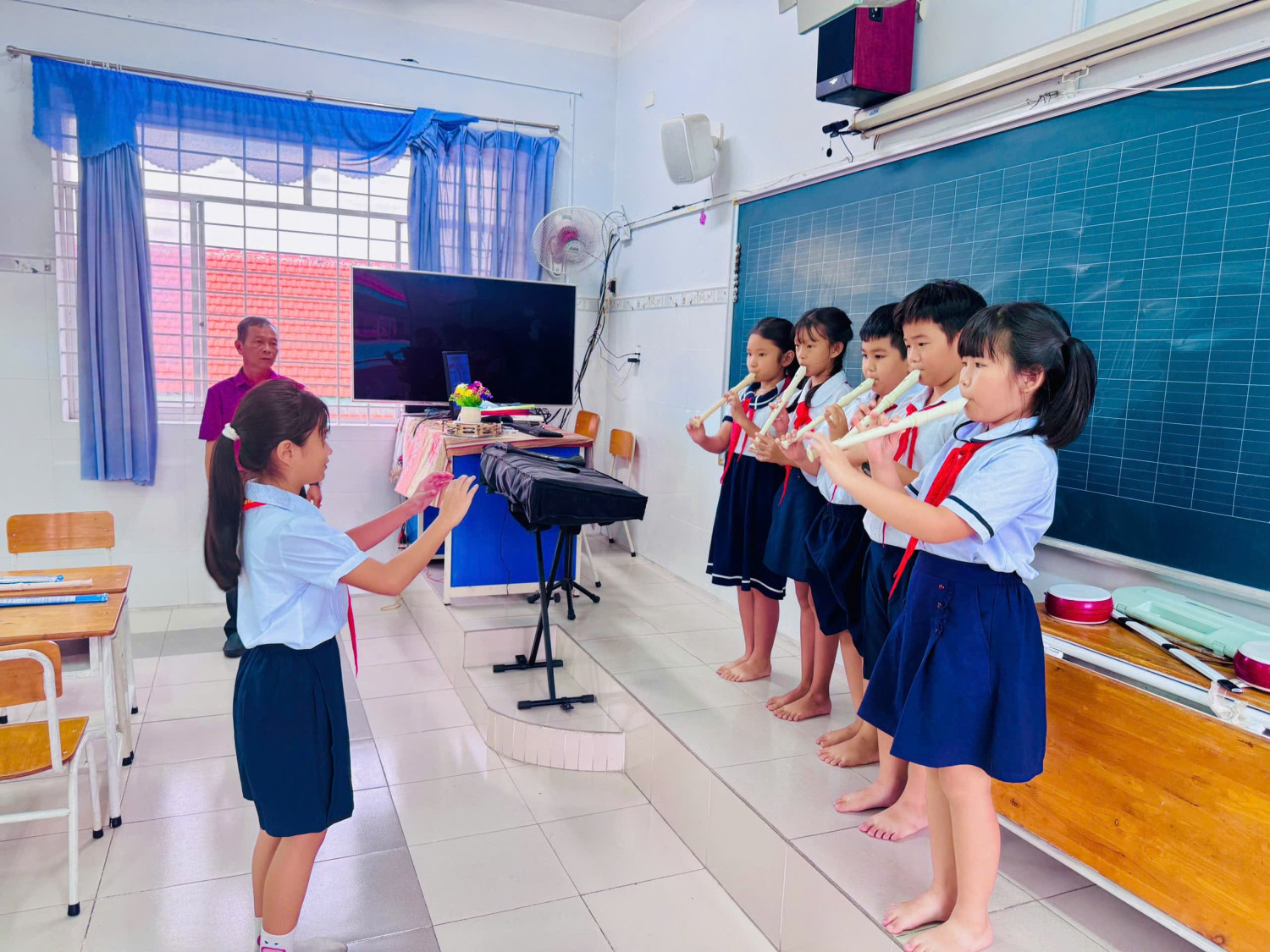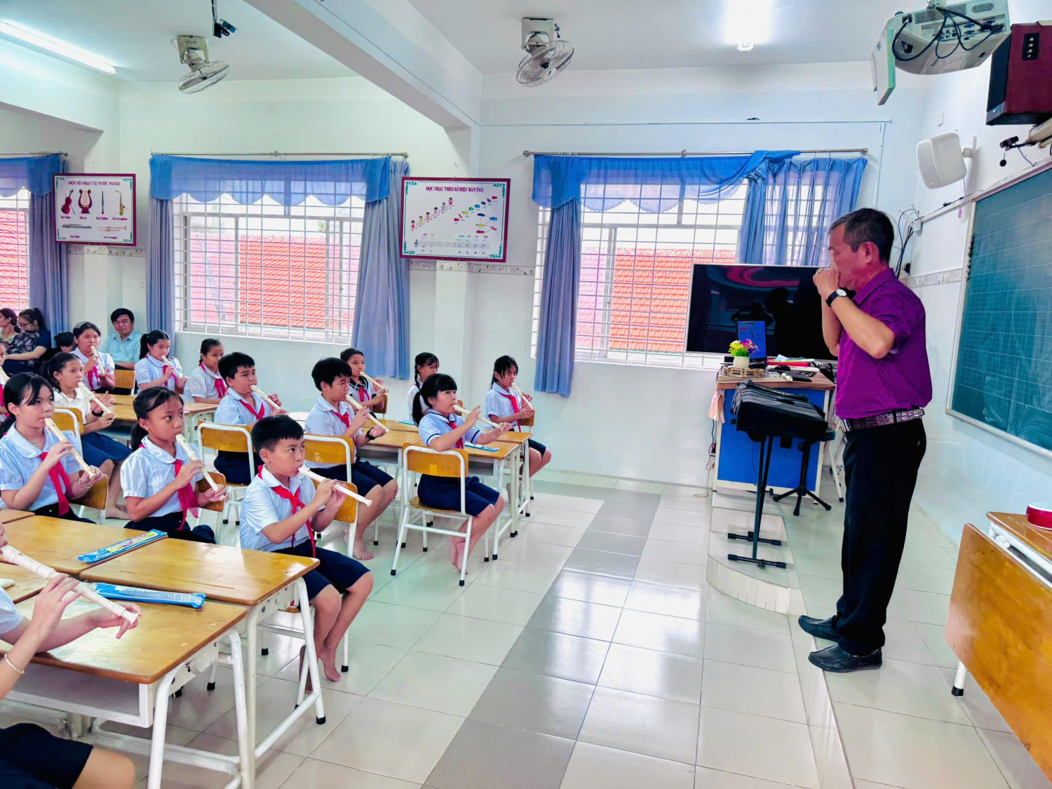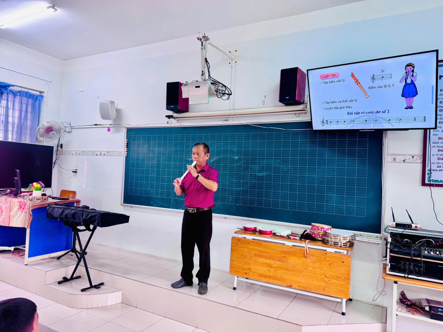 Thầy Hoàng Vũ - Giáo viên Âm nhạc đã hướng dẫn tỉ mỉ từng bước, giúp học sinh nhận biết các nốt nhạc cơ bản và tập thổi những giai điệu quen thuộc. Không khí buổi học rất sôi nổi, nhiều em tỏ ra thích thú và hào hứng khi tự mình phát ra những âm thanh trong trẻo. Bên cạnh đó, các thầy cô cũng lồng ghép trò chơi âm nhạc giúp học sinh luyện tai nghe và cảm thụ nhịp điệu tốt hơn. Buổi sinh hoạt đã mang lại cho các em những trải nghiệm âm nhạc bổ ích, khơi dậy niềm đam mê nghệ thuật.